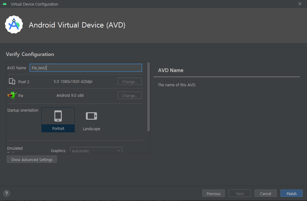 에뮬레이터의 이름을 지정하고 에뮬레이터를 생성합니다.