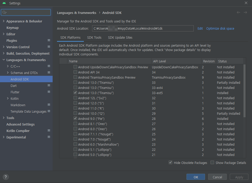 SDK Tools에서는 위와 같이 SDK를 선택하여 설치합니다.