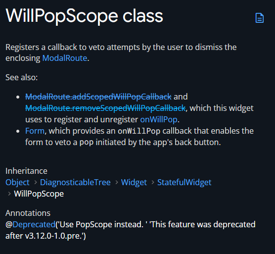 최근 Flutter가 업데이트 되면서 이 전에 사용했던 위젯인 WillPopScope가 Deprecated 되었습니다.