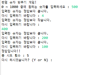 컴퓨터가 제시하는 0~1000 사이의 난수 중 사용자가 숫자를 유추해서 맞추는 게임인데,